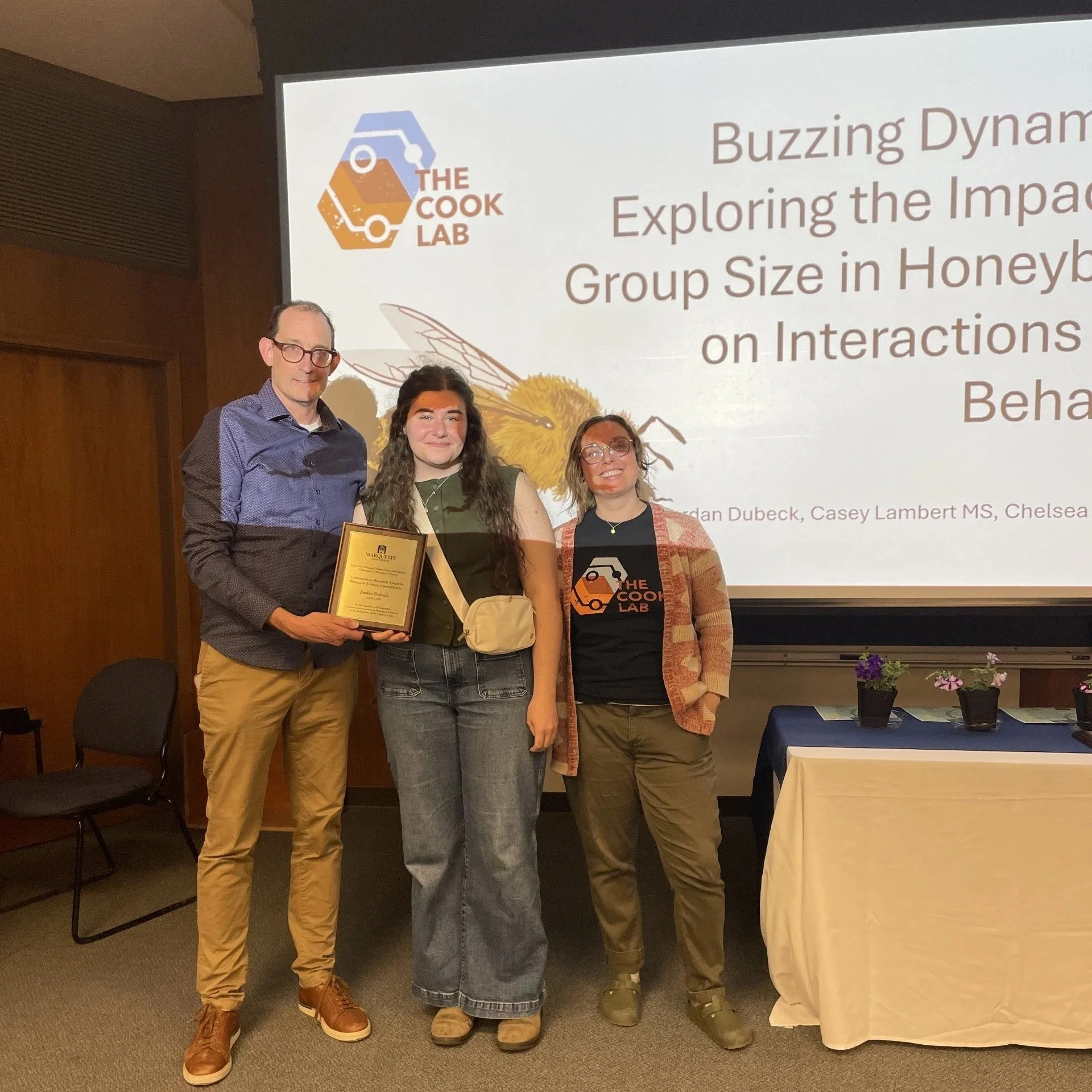 Cook Lab undergraduate Jordan Dubeck honored with Department of Biological Sciences Undergraduate Research Award 2026. She has assisted with a variety of research projects during her years in the Cook Lab and is co-authoring a manuscript of her award winning research exploring the impact of group size in interactions and group dynamics. We are so proud of Jordan!